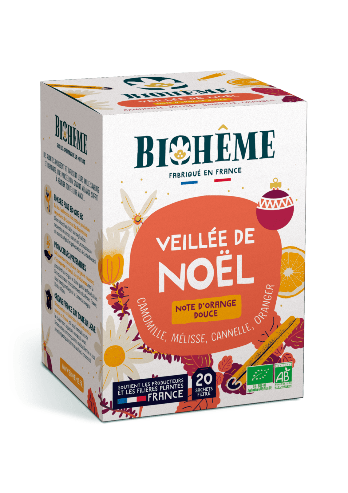 Au coin du feu, cette infusion gourmande et délicatement parfumée égaillera vos soirées. La mélisse et la camomille accompagnent la tombée de la nuit avec douceur. La cannelle et le clou de girofle facilitent une digestion légère. Ces épices douces se marient à merveille avec l’oranger.