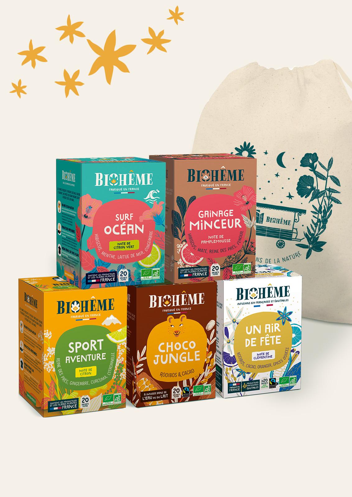 Composition de 5 infusions bio et françaises pour varier les plaisirs, sans théine ou caféine :